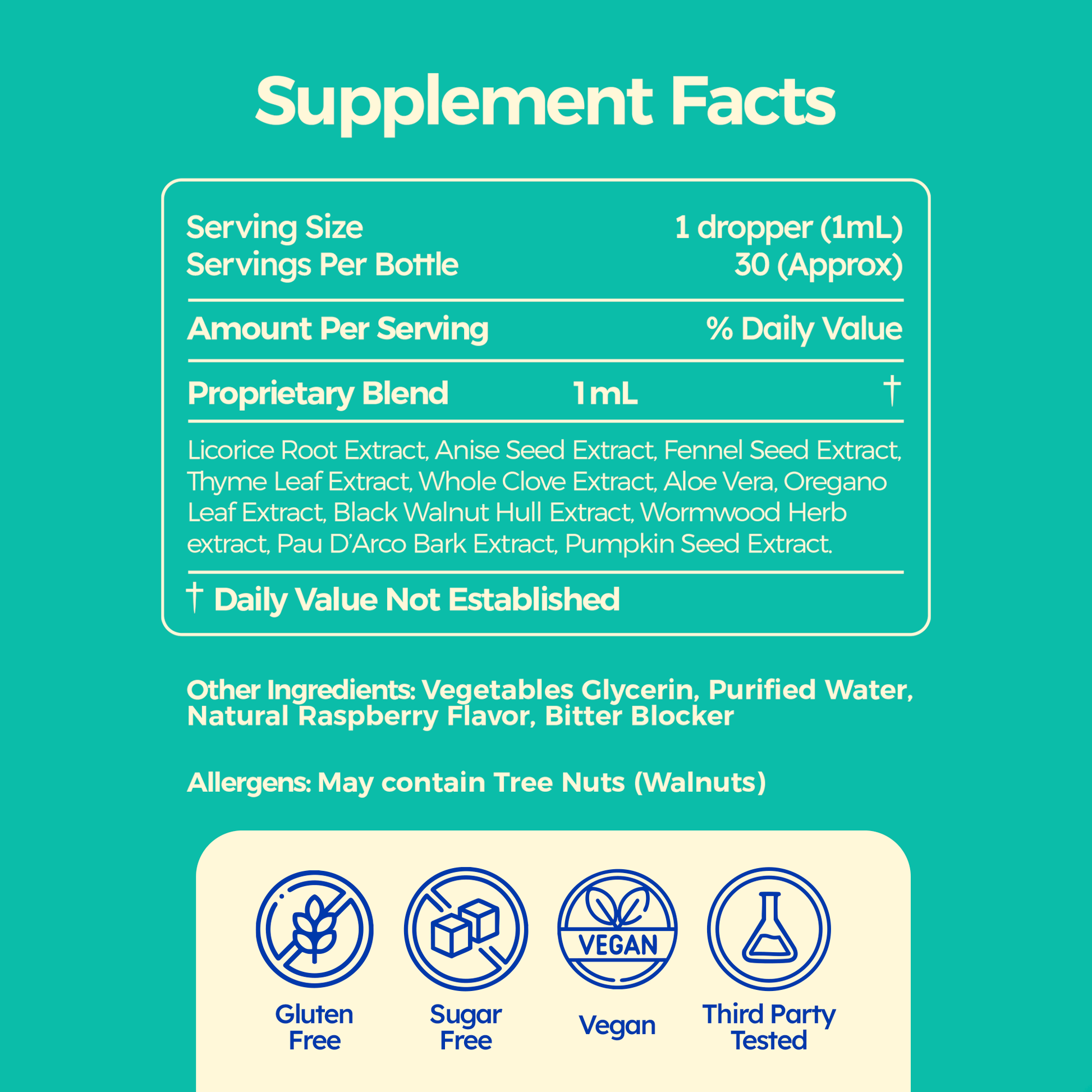 ParaHaven is safe for children 3 years and older. For children just turning 3, smaller kids, or those who are particularly sensitive, we recommend starting with a quarter dose (0.25 mL) for 3-7 days, then increasing to half dose if well tolerated. Most children 3+ can follow the standard protocol: 0.5 mL for days 1-3, then 1 mL for days 4-30. Adults can use it too, making it perfect for family cleanses.