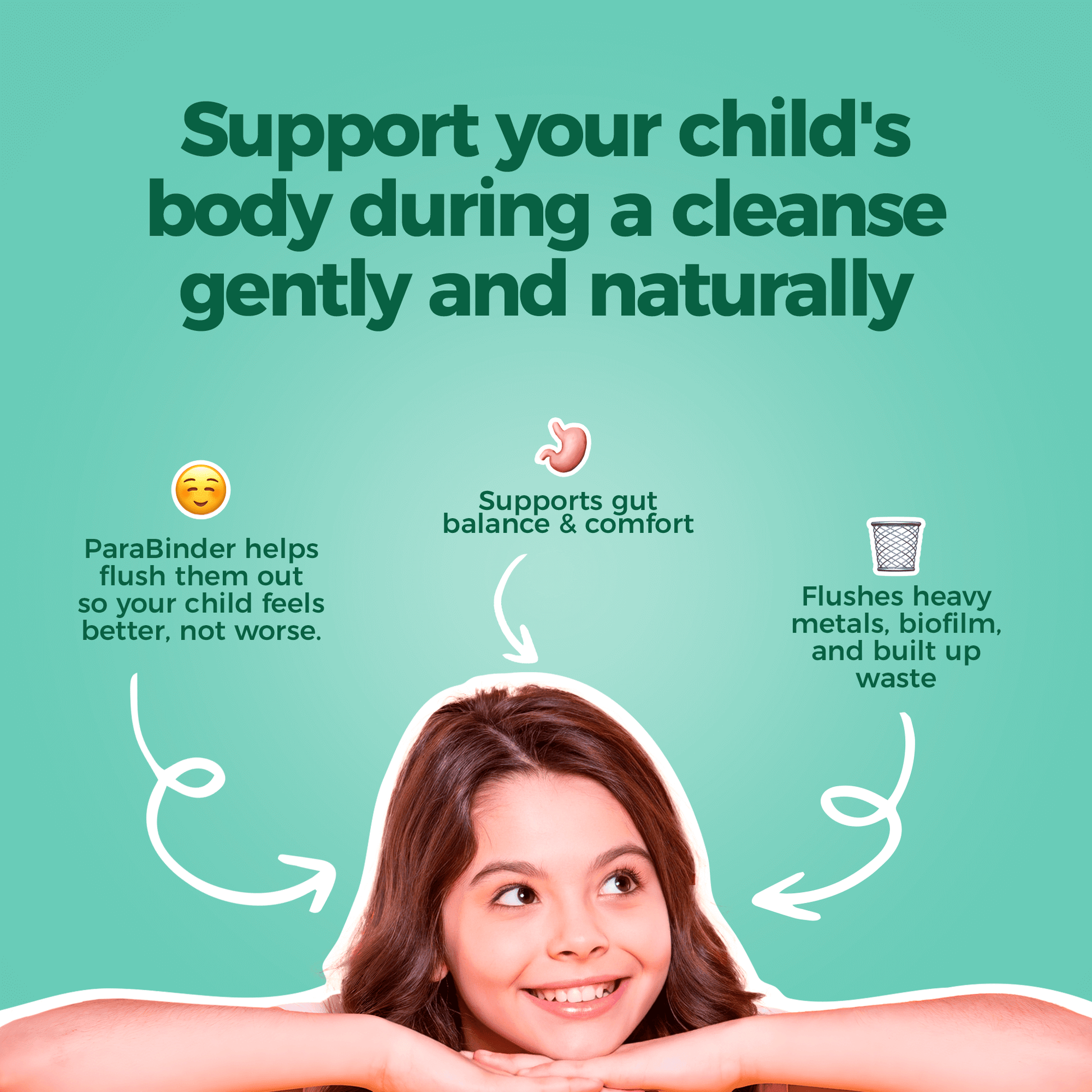 ParaBinder helps bind to that waste and flush it out efficiently. It keeps the cleanse smooth, the gut supported, and your child feeling better throughout the process.